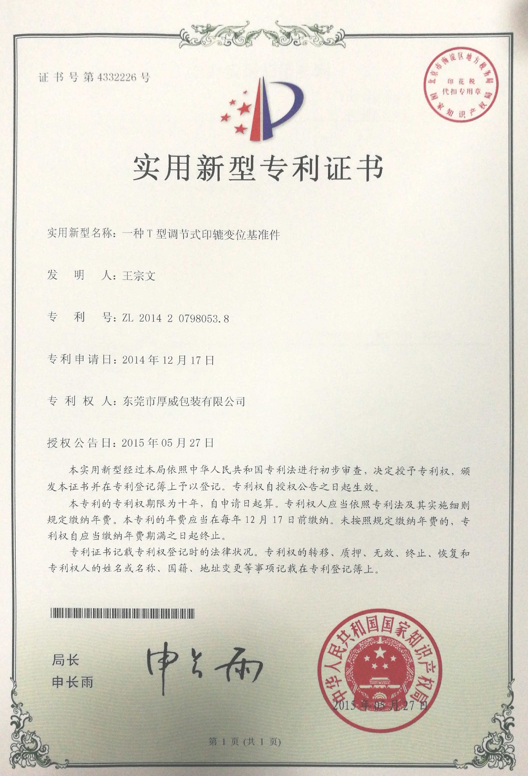 专利号ZL 201420798053